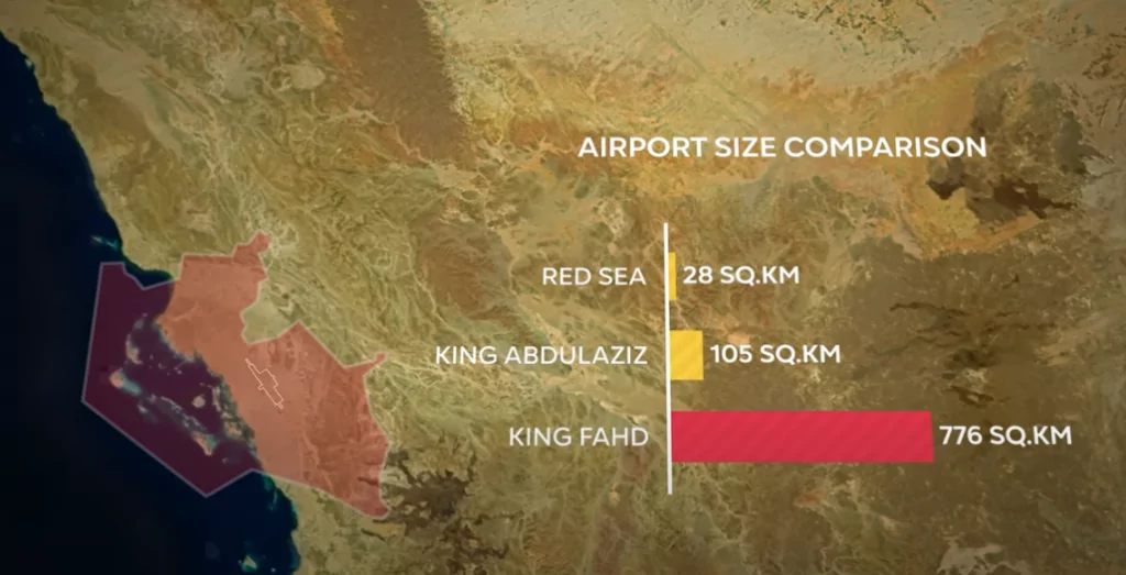 To reach the destination, the Red Sea International Airport is being built solely for this project. Located at the crossroads of Europe, Asia, and Africa, a large part of the world’s population will be within eight hours of flight distance. The airport is relatively small compared to other Saudi Arabian airports but is designed for luxury tourism, lacking a baggage claims area to reduce waiting times, with baggage delivered directly to hotels. Transportation from the airport to individual resorts will likely be provided by cars, buses, and ferries for the island resorts. The distances to most major resorts will be short despite being scattered over a large area.