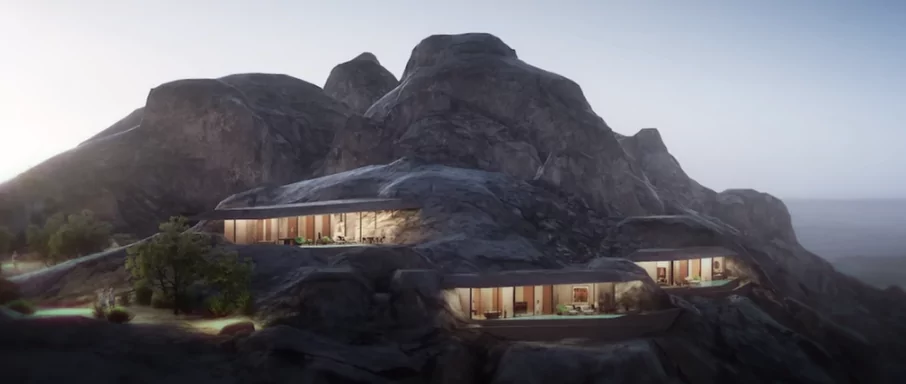 As one of the two inland resorts, Southern Dunes will host 40 villas, a hotel complex, and a large pool, all located in a remote desert landscape. The structures will be made with lightweight materials and shaped to offer natural shade to reduce reliance on artificial cooling.